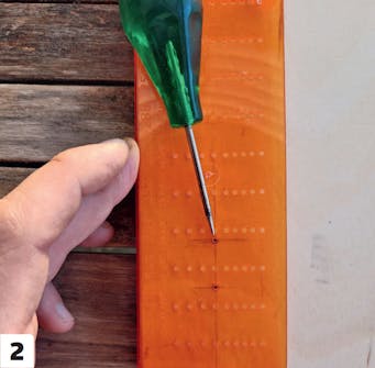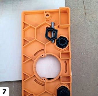 Det är dags för de två små hålen. Vi använder de två hål på jiggen som är närmast Ø 35 mm-hålet för att markera var vi ska borra ytterligare två Ø 8 mm-hål.