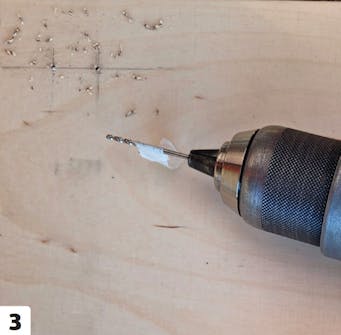 Förborra med djupstopp. Beslagen monteras med 4 x 15 mm skruvar med kullrigt huvud. Skruvarna måste förborras så att de inte skadar fanéren. Vi använder en bit tejp som djupstopp så att vi inte borrar igenom.