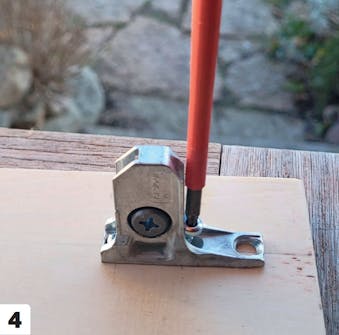 Beslagen skruvas fast ordentligt. Om lådan skall sitta längst ner i en stomme, använd de två hålen på samma sida om den höga metalldelen. Om lådan ska sitta i mitten, använd de två hålen närmast den.