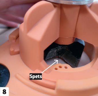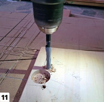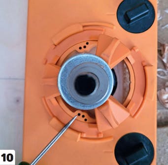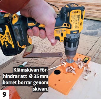 Forstnerborret körs försiktigt. Vi kör med låga varvtal och stannar halvvägs för att avlägsna spån. Vi använder en bricka som placeras mellan jiggen och borren som djupstopp.
