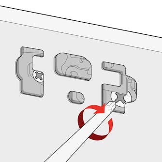 Om köksluckan inte sitter plant med framkanten på skåpet när den har stängts eller om avståndet mellan luckorna inte är lika stort överallt, ska luckan justeras. Det göär du på de allra vanligaste gångjärnen genom att vrida på skruven närmast köksluclan. Dra den mot uret flyttas luckan åt höger, med uret dras den åt vänster.