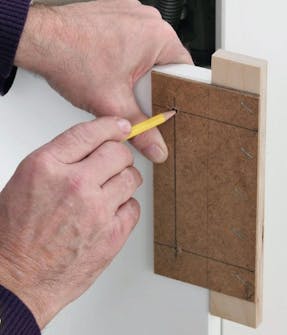 Markera på dörrar och lådor var handtagen ska sitta. Det gör du genom att hålla mallen så att den hamnar i hörnet på skåpdörren. Stick sedan in en penna i hålen och rita märken på dörren.