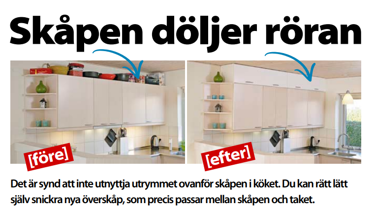 Utrymmet ovanför skåpen mäts noga innan du sågar ut delarna. Mät på flera ställen så att du inte luras av ev. skevheter i huset. Överför måtten till ritningen på föregående sida och såga. Markera med pilar åt vilket håll delarna ska sitta.
