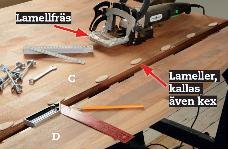 De två skivdelarna C och D sätts ihop med 8 lameller (kex). Avstånden mellan kexen bör vara 10-15 cm. De läggs ovanpå skivan och vi markerar därefter var vi ska fräsa för dem.