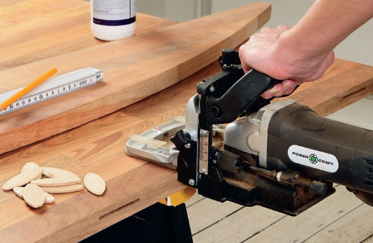 De två delarna till bänkskivan sätter vi ihop med lamellkex och lim - och för säkerhets skull också ett par beslag.