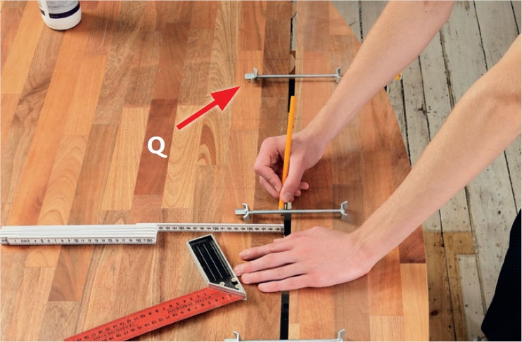 De två delarna låses dessutom med fyra monteringsbeslag Q. De placeras så att de inte kolliderar med någon av lamellerna och därefter sätter vi märken för dem på bägge skivorna.