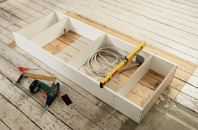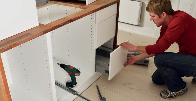 Lådorna sätts ihop enligt tillverkarens anvisningar och sätts på plats i underskåpen.