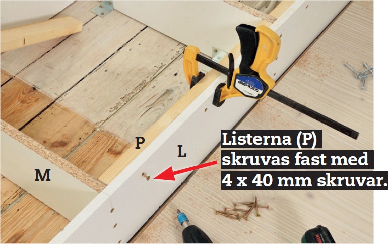 På den invändiga sidan av sockeln fästs fyra stödlister P. De har en enda funktion, nämligen att förse oss medlite trä att fästa underskåpen i.