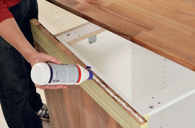 Bänkskivan pressas ner med tvingar medan den skruvas fast från undersidan genom de övre listerna eller skivorna på skåpen med 4 x 40 mm skruvar.