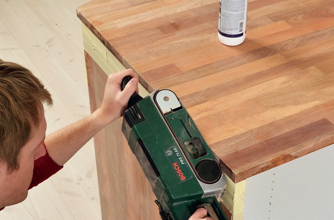 När de två sidorna har skruvats fast kan vi fortsätta med bänkskivan, som ska limmas fast på kanten av sidorna. Men vi fäster den också med 4 x 40 mm skruvar som dras i nerifrån skåpen genom toppskivorna. När limmet har torkat kan fogen finputsas med slippapper.
