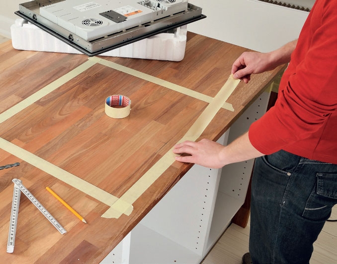 Det är smart att fästa maskeringstejp där hällen ska fällas ner, för på tejpen syns dina streck tydligt. Borra ett hål i ena hörnet och såga sedan ut för spishällen.