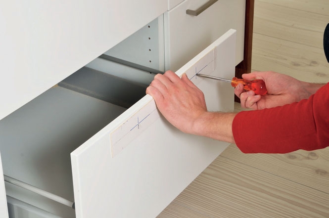 Hålen för beslagen borras med 35 mm kvistborr. Det är viktigt att använda borrstativ för att hålen ska hamna rätt och för att borren inte ska gå rätt igenom skivan.