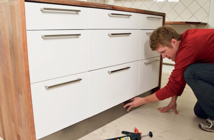 Fronten vippas på plats och pressas fast mot sockeln. Ett par limknektar kan ev. användas för att hålla fronten på plats medan limmet härdar.