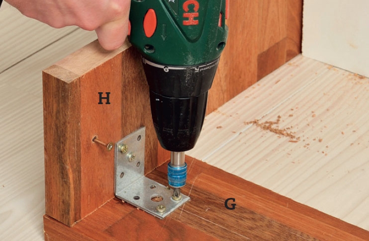 På baksidan gör vi en ny sockel av delarna G och H. De skruvas ihop med vinkeljärn och 4 x 20 mm skruvar.