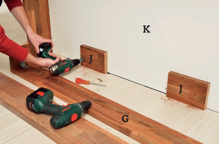 På bakstycket K skruvar vi fast två stödklossar J med 4 x 40 mm skruvar. Klossarna ska stötta den undre hyllan tillsammans med dem på sidorna.