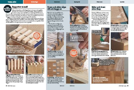 Kännetecknet på en perfekt fingerskarv är att tappar och tapphål är lika breda och att skarven är tät. Uppdelningen i tappar/tapphål ska göras så att en tapp och ett tapphål har en viss bredd, alltså får det inte bli en tunn flisa i träets yttersidor. Fronten och sidorna på den låda som visas har tillverkats av hyvlad ek med måttet 15 x 142 mm. Tappar och tapphål är 15 mm breda. Vi bygger en mall som säkerställer att markeringarna blir identiska.