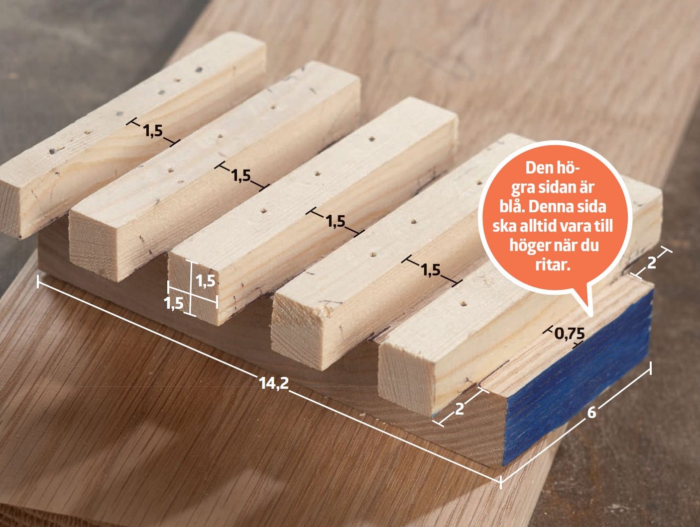 Mallen består av en träbit (15 x 14,2 cm lång och 6 cm bred). Mät 7,5 mm från ”den blåa sidan” och placera en bit av en list med måttet 15 x 15 mm så att den sticker ut 2 cm på bägge sidor om mallen. Placera lister med måttet 15 x 15 mm parallellt på ett 1,5 cm avstånd på resten av mallen.