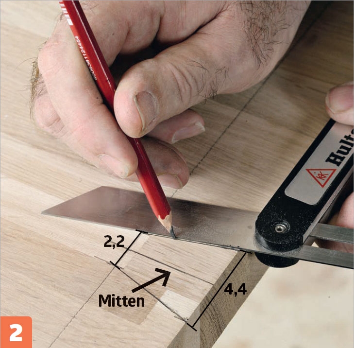 Rita upp tapparna. Använd de uppmärkta tapparna och tapphålen i ändträet som utgångspunkt och rita upp på bordsskivan. Även den här gången ska man rita upp på skivans bägge sidor innan man sågar.