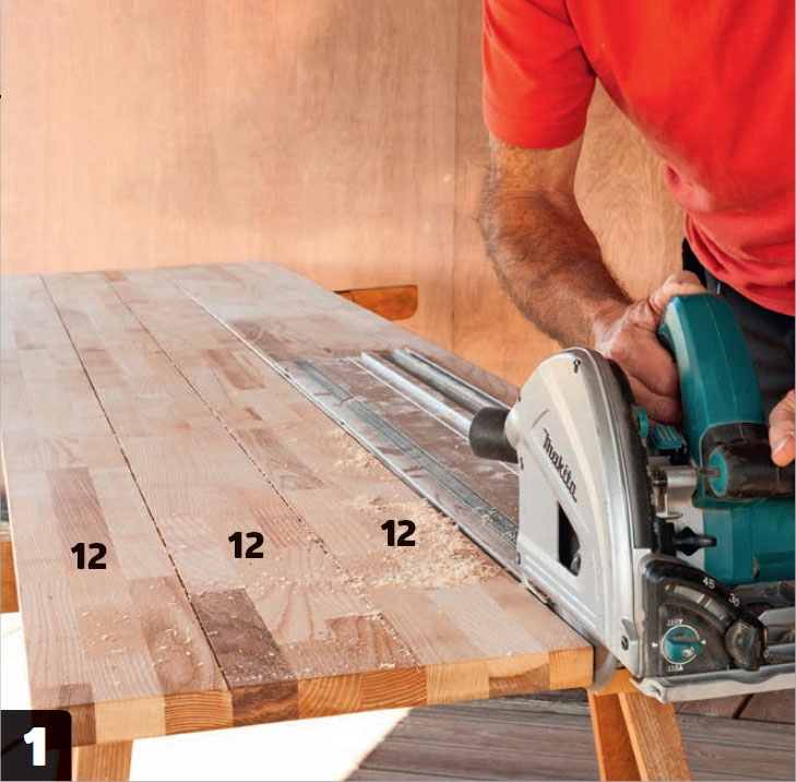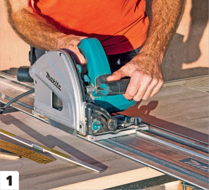 Skåpsidor och botten sågas ut. Här används sänksåg med styrskena, vilket förenklar att såga långa, raka snitt. Även en cirkelsåg och en rak bräda kan användas.