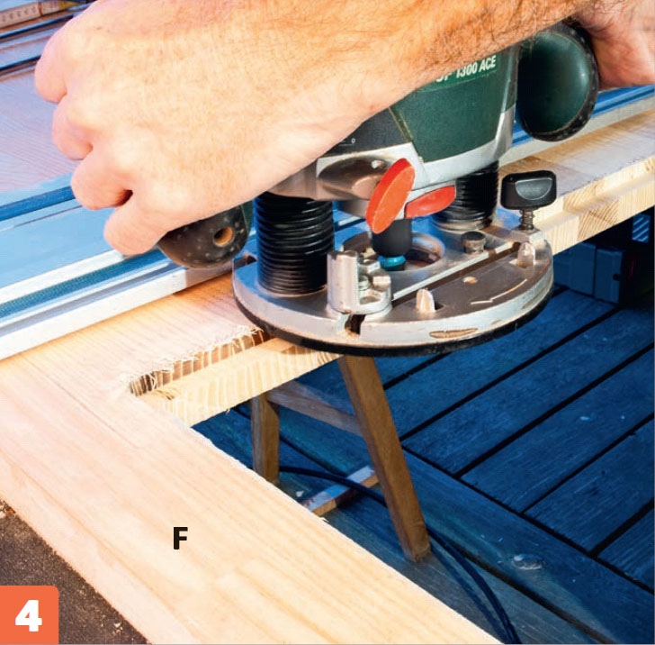Skruva fast bänkskivan (F) i möbelvinklarna med 4 x 25-mm-skruvar, två på varje sida (D) i fram- och bakkant. Det är smart att låta skivan kunna röra sig lite genom att låsa den antingen framme eller där bak.