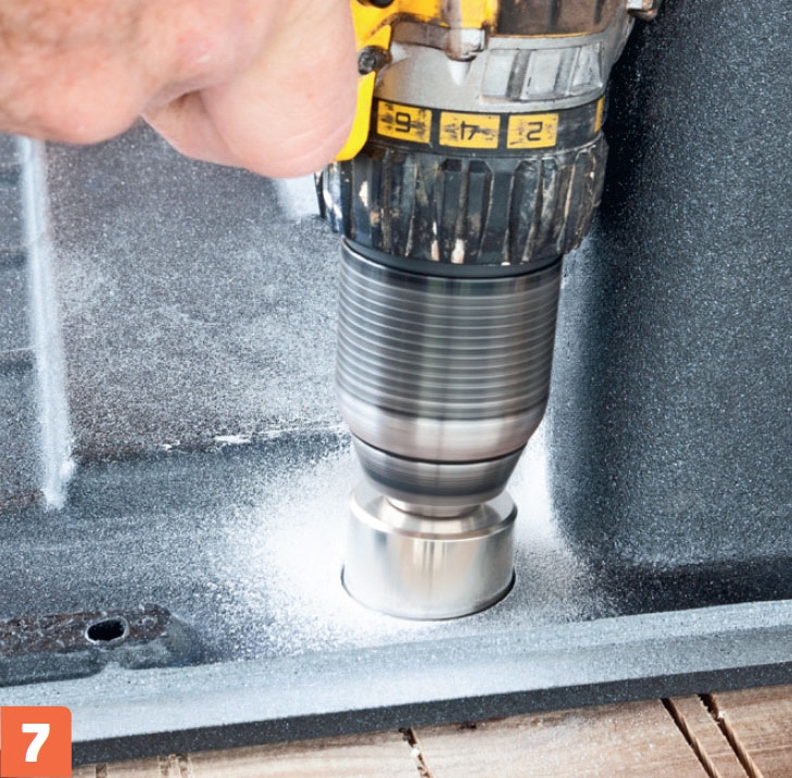 Här borras hål för blandaren i vasken med hjälp av ett specialborr som ofta kan beställas tillsammans med vasken.