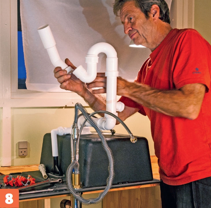 Bänkskivan ska sågas till på längden, förses med bakkantslister och få hål utsågade för vask och spishäll, innan den fästs ovanpå skåpen.