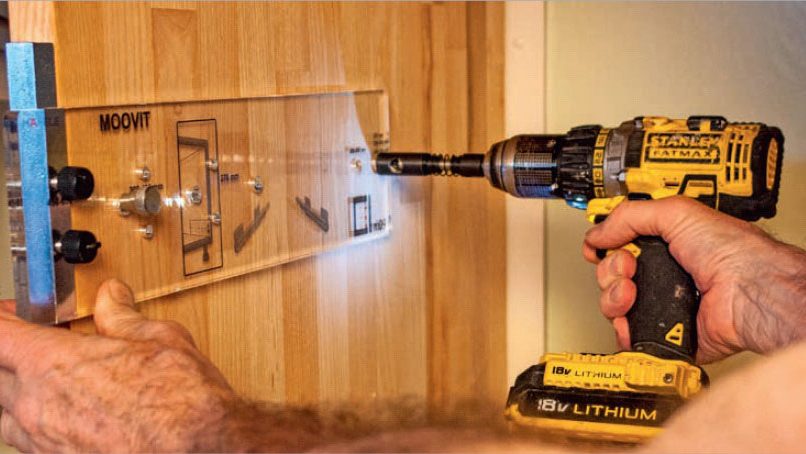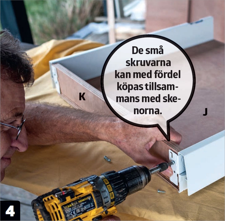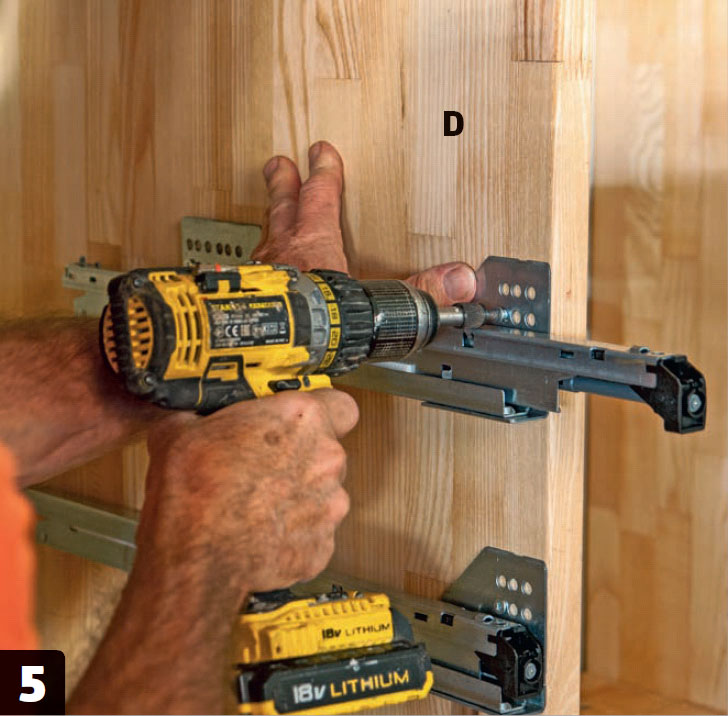 Skenorna skruvas fast i skåpets sidor (D). Även här används skruvar som beställts med skenorna. I förväg har det borrats hål för skenorna med hjälp av en borrmall från Häfele.