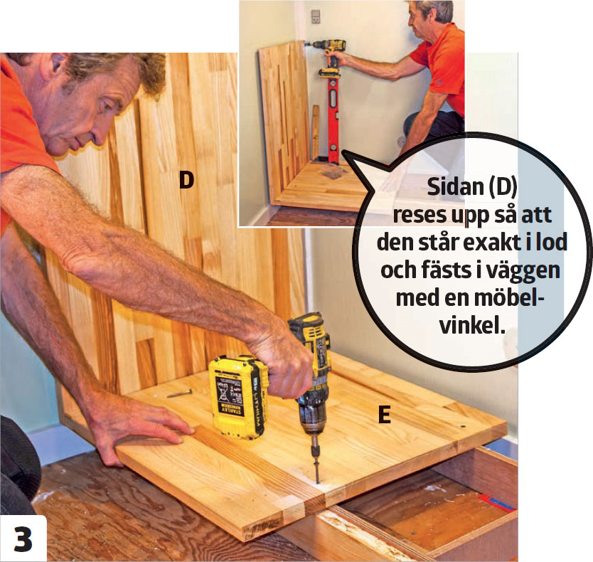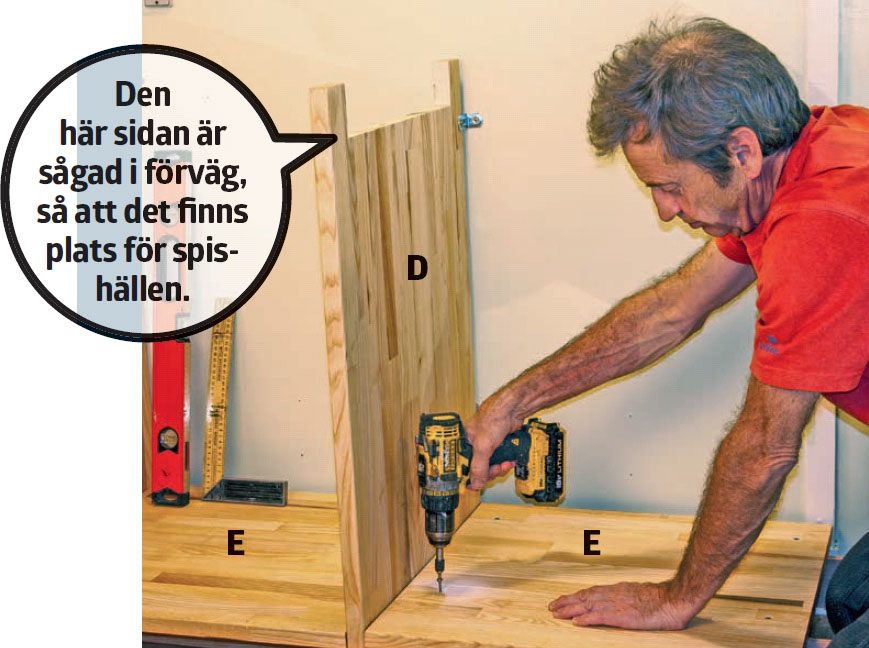 Första skåpsidan (D) och botten (E) skruvas ihop från skåpsidan, så att den blir gavel på vänster sida. Förborra innan du skruvar, så att du inte riskerar att träet spricker. Här används tre 4,5 x 60-mm-skruvar.