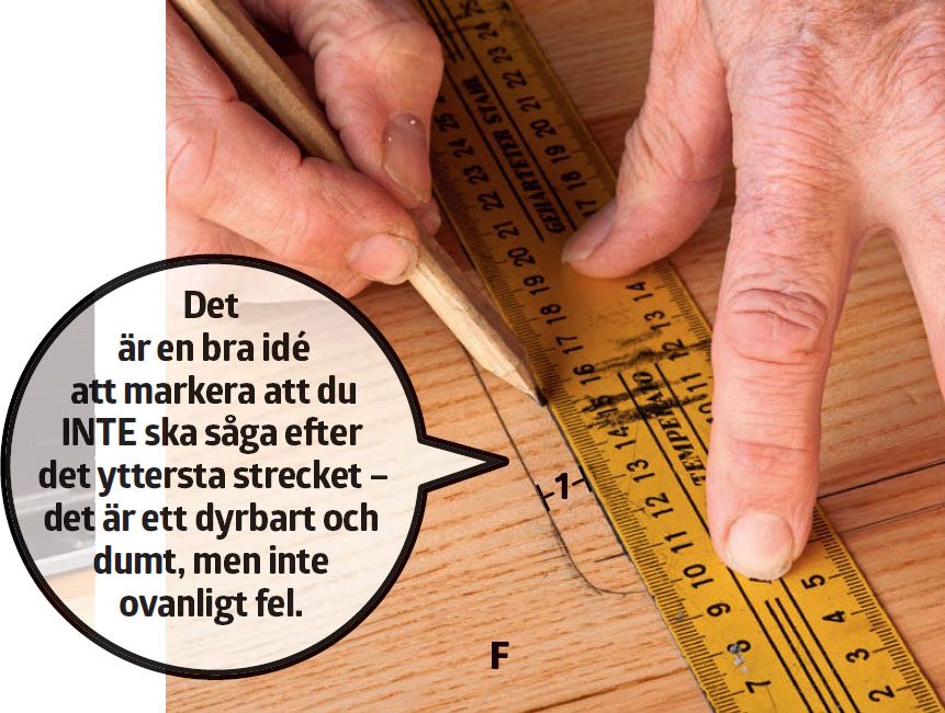 Sätt ett nytt streck 1 cm innanför första markeringen. Det är här hålet till vasken ska sågas. De långa snitten i hålet sågas till med sänksåg och hörnen med sticksåg, så blir resultatet så exakt som möjligt.