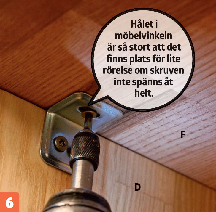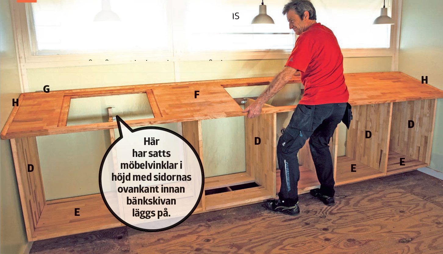 Bänkskivan (F) läggs på plats. Den skruvas Den skruvas fast i skåpsidorna (D) med möbelvinklar. Det är smart att fästa de innersta på alla sidor innan skivan läggs på, så att du kan komma åt bättre.