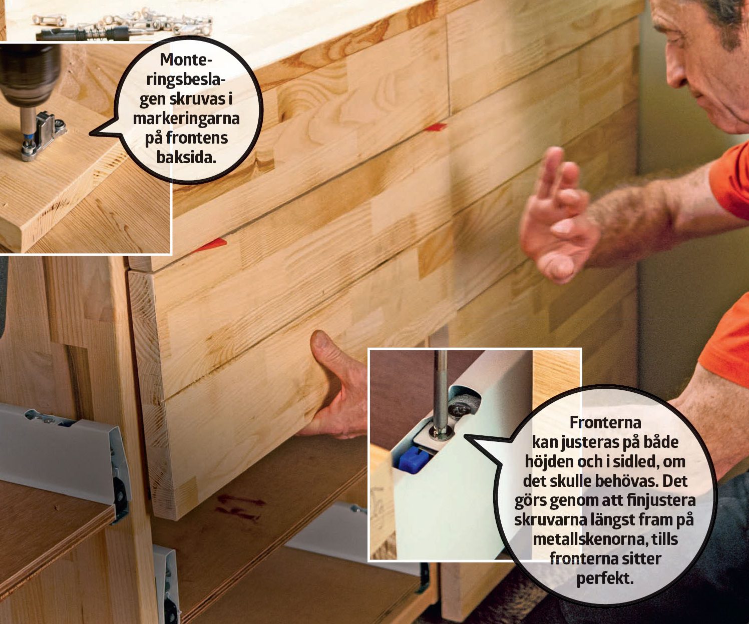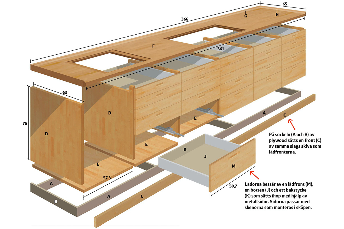 Lådornas botten- och bakstycken sågas ut och sätts ihop med metallskenorna och lådfronterna. De ihopsatta lådorna monteras på skenor som fästs i skåpstommarna.