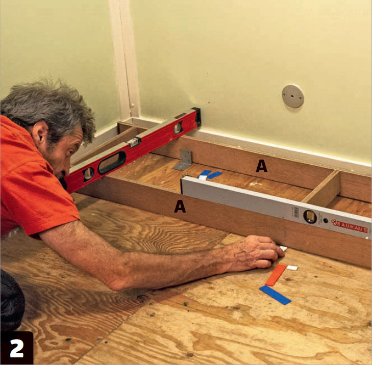 Sockeln skruvas ihop av ett fram-och bakstycke i full höjd med lite lägre mellanbitar. Fördelen med att mellanbitarna får lite luft till golvet är att du då inte riskerar att få problem med eventuella ojämnheter. Här har sockeln byggts av plywood, men MDF- eller limträskivor går också bra.