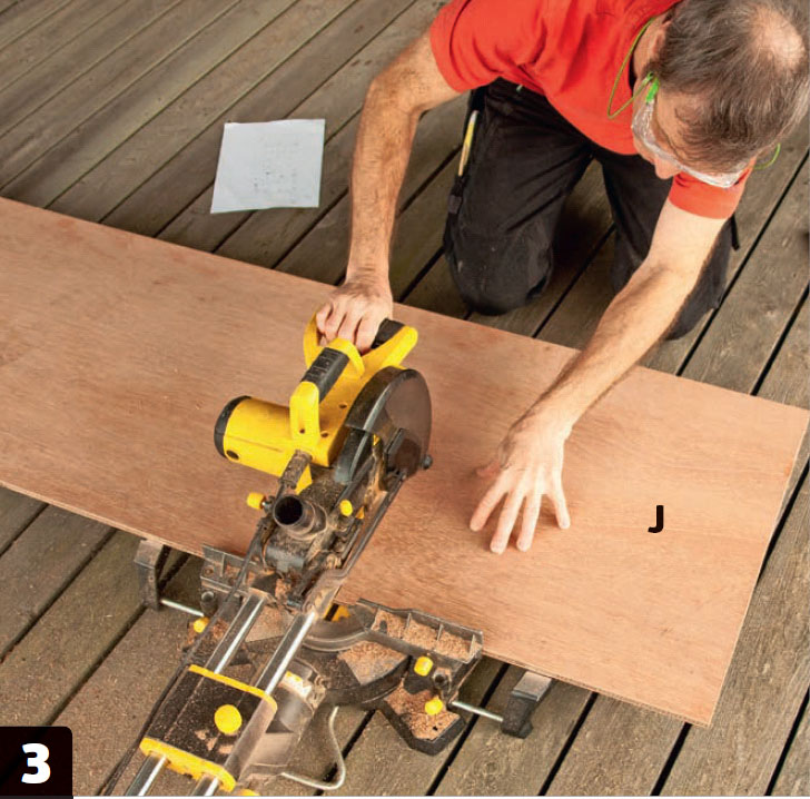 Bottnar (J) och bakstycken (K och L) sågas till av plywood. Skivans djup ska motsvara lådans metallsida, hellre för kort än för lång. Bredden ska motsvara skåpsöppningens bredd minus 62 mm.