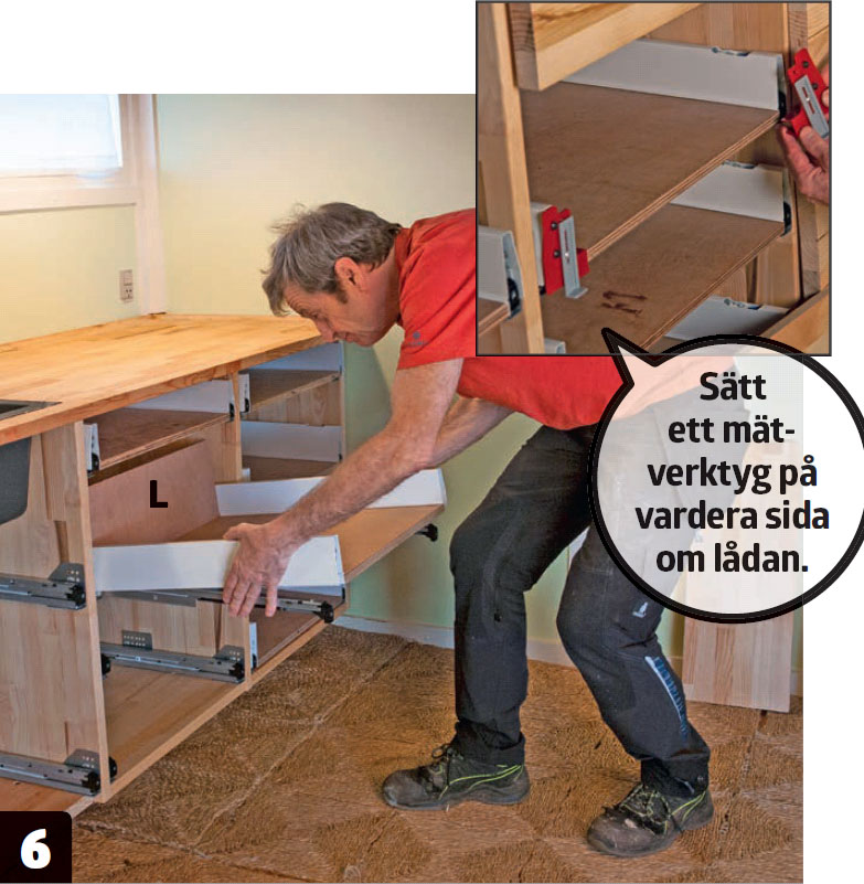 Lådorna sätts på plats i skenorna, och de två mätverktygen som följer med lådorna, placeras på kanten av metallskenorna. Mätverktyget används för att placera ett beslag, så att fronten kan monteras.