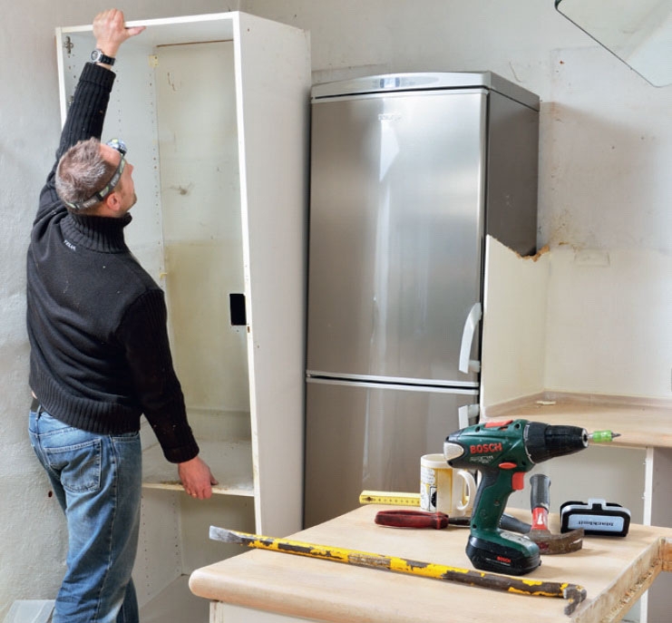 Vid sidan av kylen sätts ett högskåp. Det lyfts också upp på sockeln och skjuts in mot väggen innan det skruvas fast i sockeln och väggen.
