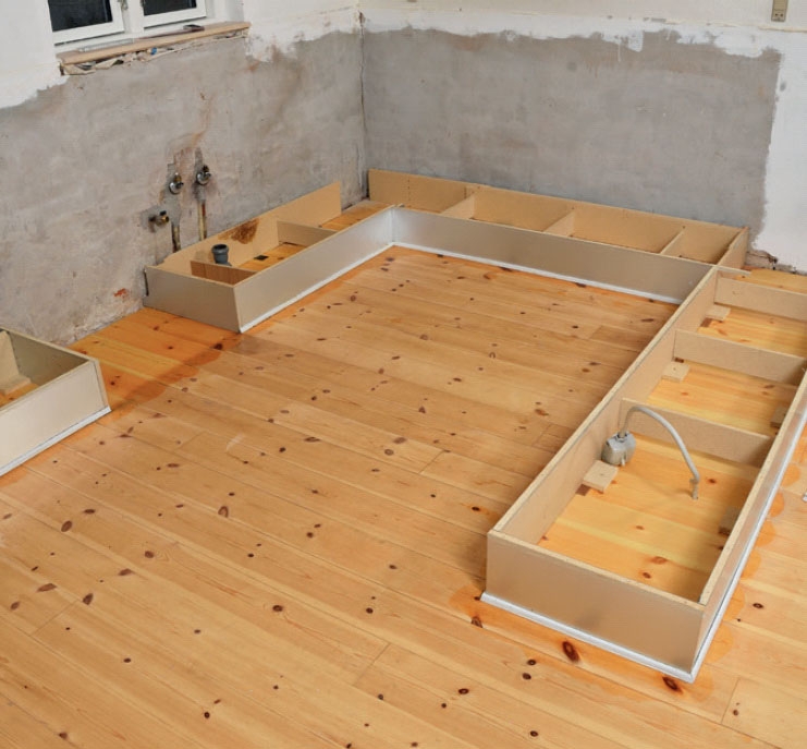 Om man inte kan se in bakom skåpen från sidan kan du först montera en kraftig list på väggen och ställa skåpen på denna list. Det kan du se i nr 14/2006 ”Alla har rätt till ett lätt kök”. Artikeln finns också på vår webbplats, ww.gds.se
