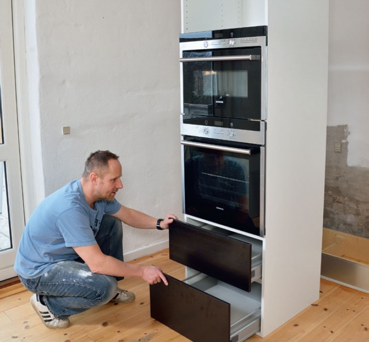 Sätt ihop skåpen. Här är det ett högskåp för ugn och mikro. Om sidorna blir synliga när skåpet står på plats gäller det att inte repa dem under arbetet.