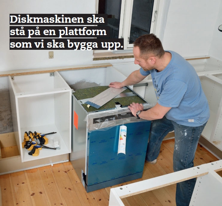 Vår nya diskmaskin står på ben som inte kan balansera på sockeln, så vi bygger en plattform för diskmaskinen så att den kommer på rätt höjd.