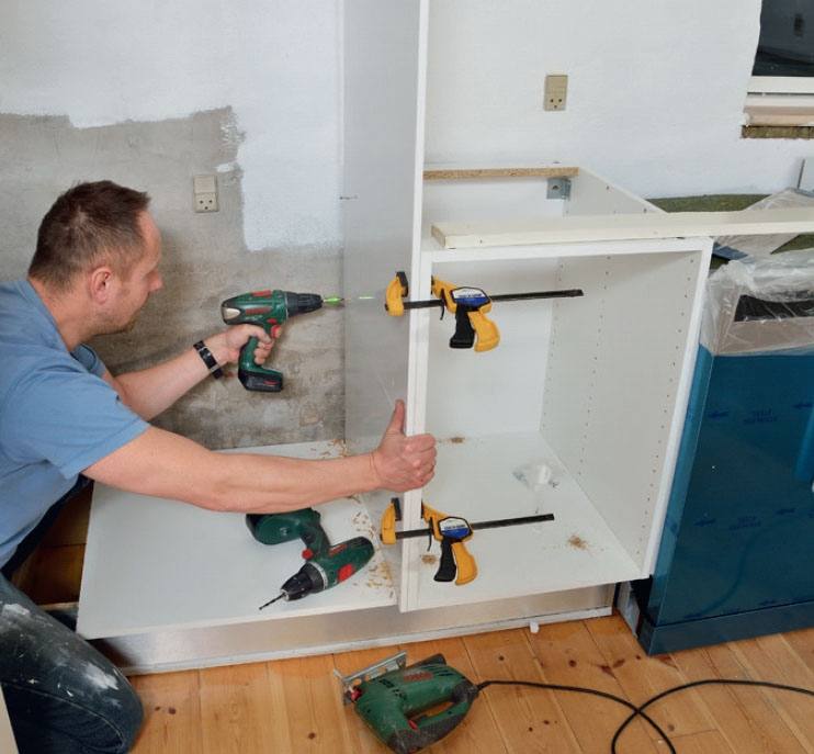 Det är klokt att fixera skåpen vid sidan av varandra med snabbtvingar medan de skruvas ihop med s.k. hopsättningsskruvar.