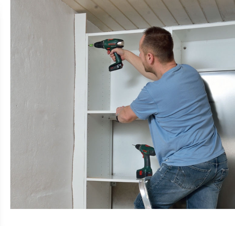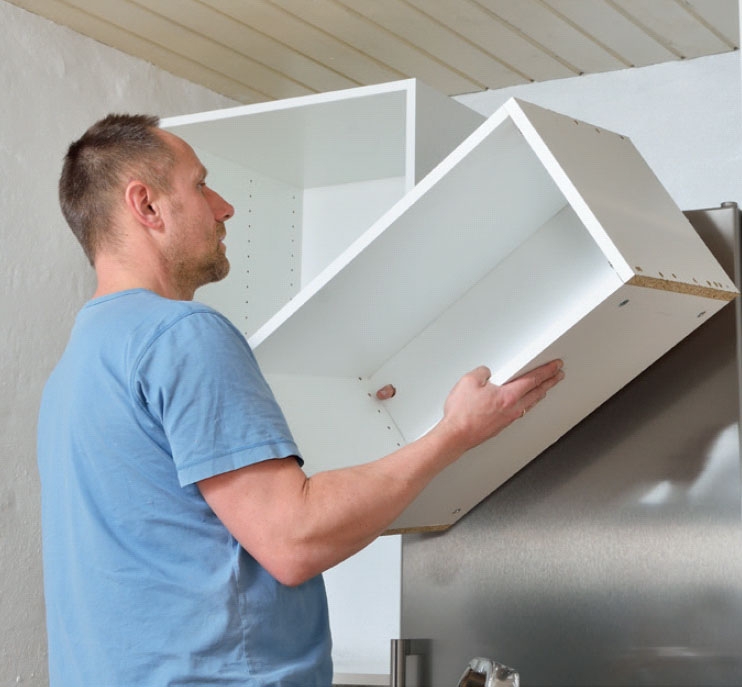 Ställ överskåpet på den lilla bocken. Då blir det lätt att skjuta in skåpet mot väggen, styra det på plats och skruva fast det. Du kan t.o.m. montera flera skåp på en gång på detta sätt.