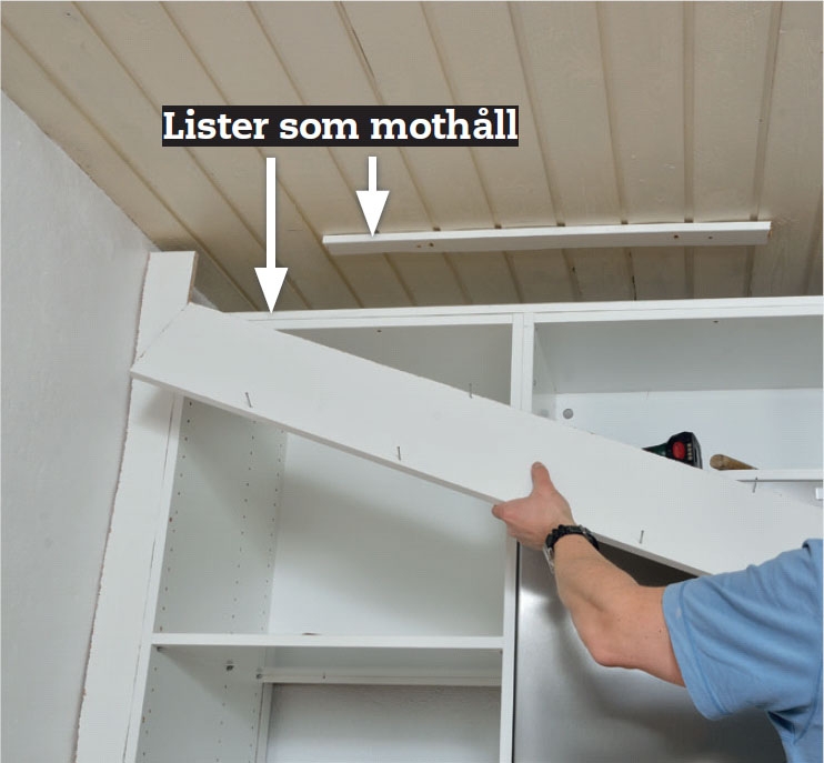 Här behövs en passbit mellan högskåpet och väggen och ovanför skåpen ska vi montera en täcklist.