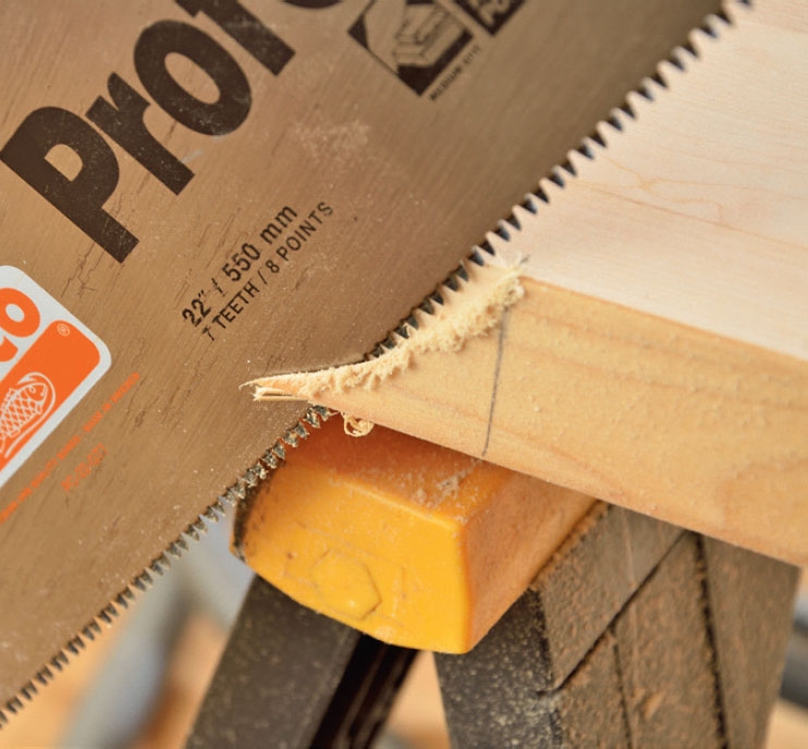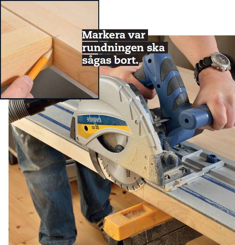 Den avrundade kanten ska sågas bort där två bänkskivor möts med kortände mot långsida. Därför gäller det att markera noga var det ska sågas.