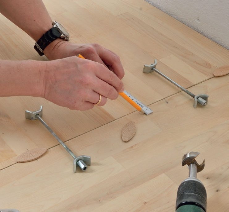 Borra hål för beslagen. Använd helst en kvistborr som gör en plan botten och som inte har en spets som går igenom träet och skadar ovansidan.