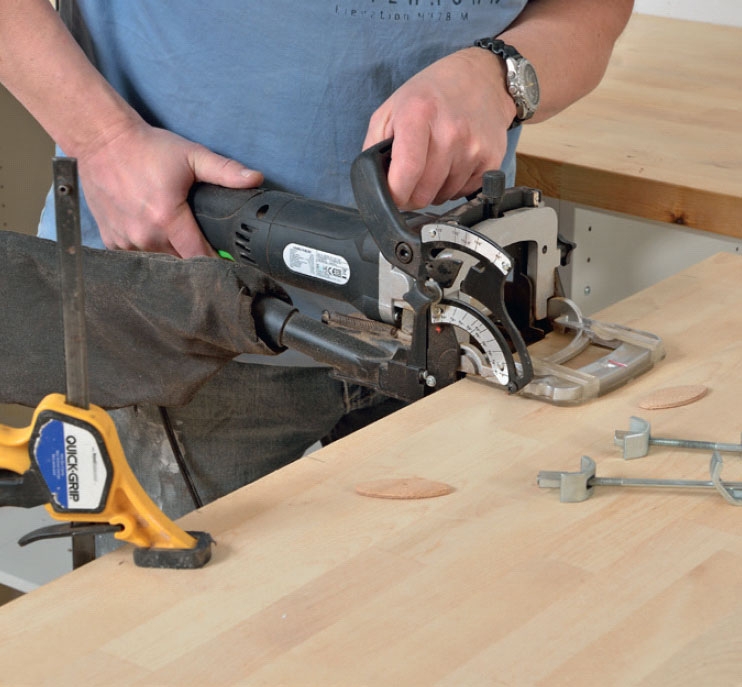 För att få det tätt spänner du ihop skivorna med hjälp av bänkskivebeslag (kopplingsbeslag för bänkskivor). Om du samtidigt fräser in lameller i kopplingsytorna och limmar ihop delarna så blir det tätt. Här använder vi riktiga lameller och fräser spår för dem med en lamellfräs. Spåren kan annars fräsas med handöverfräs och skivfräs.