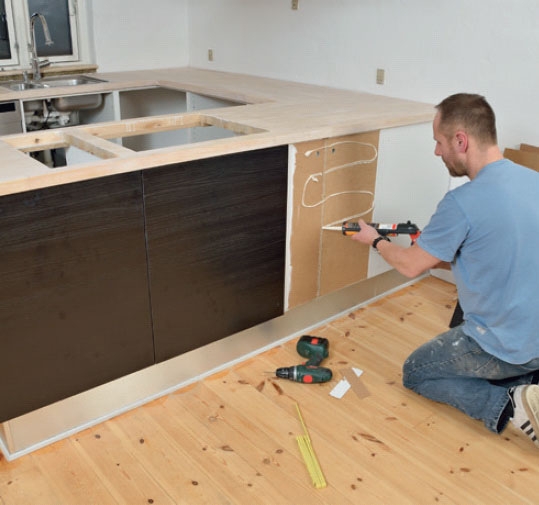 Här skruvar vi fast alla skåpen på sockeln med skruvar genom bottnarna. Det är bra att dessutom skruva fast dem i väggen för att de ska stå extra stadigt.