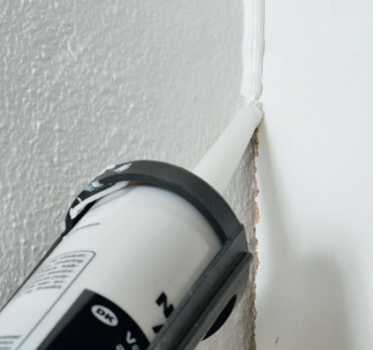 I detta kök har en rad underskåp satts upp som en köksö och det innebär att några av dem vänder baksidan utåt. Det ser inte så snyggt ut så därför kläs de med skåpdörrar av samma slag som används i köket. De passar i storlek och monteras från utsidan med monteringslim. Från insidan av skåpen fästs de med 4 x 20 mm skruvar, en i varje hörn och två på mitten. Mellan bänkskivorna och väggen ska en list monteras som döljer den lilla springan. Det räcker med en liten smyglist och det lättaste är att fästa listen på bänkskivan innan denna monteras. Om det ändå finns någon liten springa mellan listen och väggen eller mellan några skåp och väggarna, så kan de trollas bort med lite akrylfogmassa. Pressa ut en tunn sträng och släta till den med fuktig pensel.