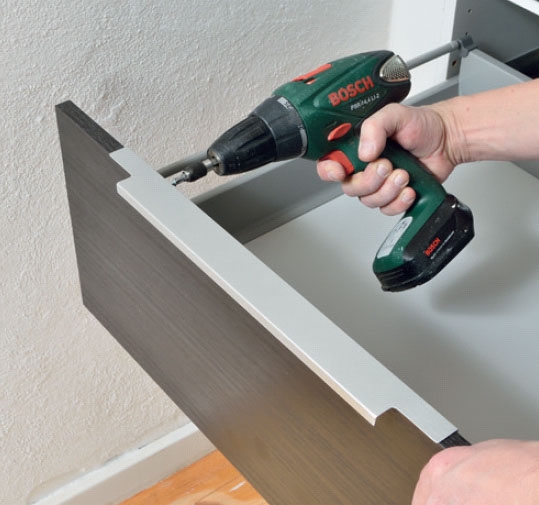 Passbiten skruvas fast på sidan av högskåpet. Den kan sitta kant i kant med skåpet, men det blir snyggare om den dras in en smula.