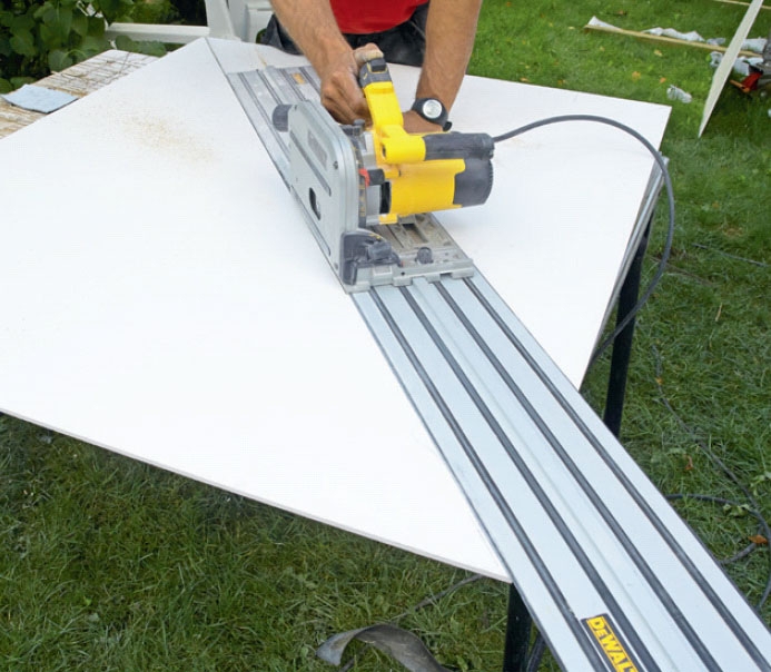 Skivorna är hårda att såga i, så använd t.ex. en diamantklinga. Dammet är mycket fint; därför bör du använda mask och gärna en såg med uppsamlingsfunktion. Skivorna monteras vanligen med utomhusskruvar eller särskilda clips.