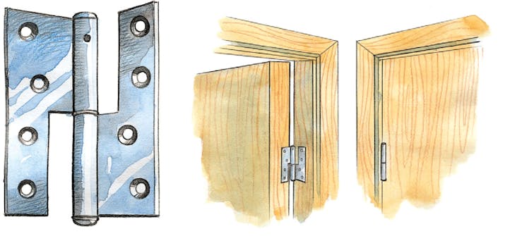 Det vanliga gångjärnet med tapp som gör att dörren/fönstret kan lyftas av. Dörren/fönstret ligger inne i karmen, så man måste göra urtag för gångjärnen.