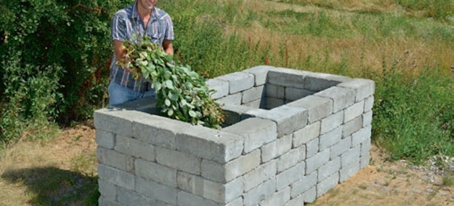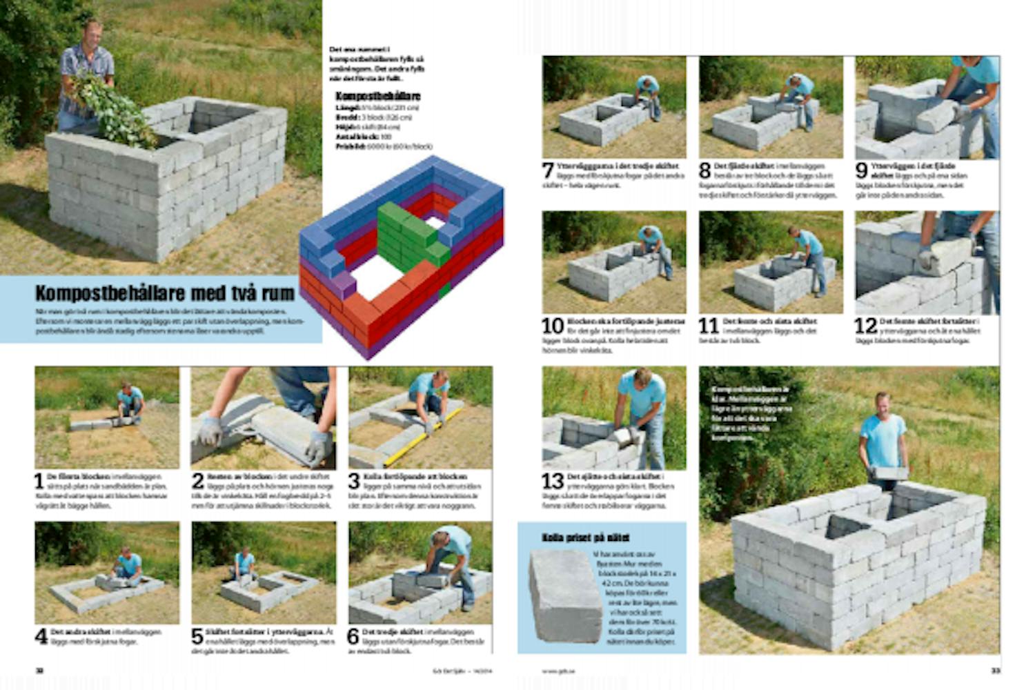 När man gör två rum i kompostbehållaren blir det lättare att vända komposten. Eftersom vi monterar en mellanvägg läggs ett par skift utan överlappning, men kompostbehållaren blir ändå stadig eftersom stenarna låser varandra upptill.